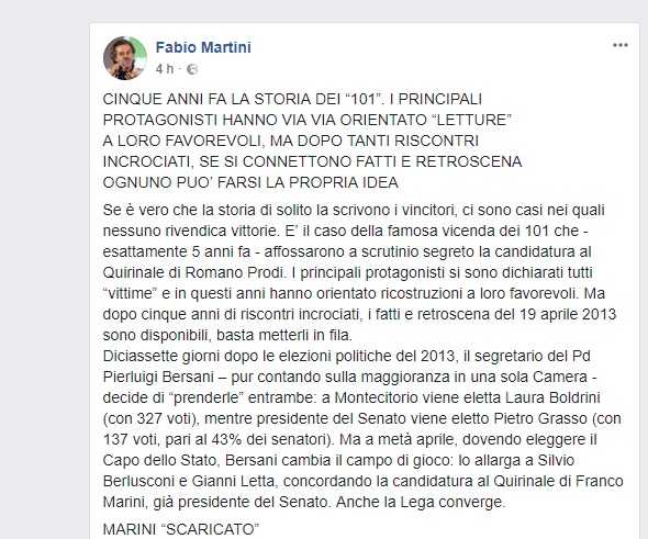 In occasione del quinto anniversario di quel fallimento il gornalista della Stampa Fabio Martini ha ripercorso su Facebook le spinte che portarono al fallimento della candidatura dell’ex presidente del Consiglio. Martini risponde all’articolo del direttore dell’Espresso Marco Damilano, che ha evidenziato il ruolo di Matteo Renzi nella vicenda dei 101 franchi tiratori. Per il giornalista della Stampa l’ultimo segretario del PD, ora dimessosi, ha avuto invece un ruolo da comprimario.