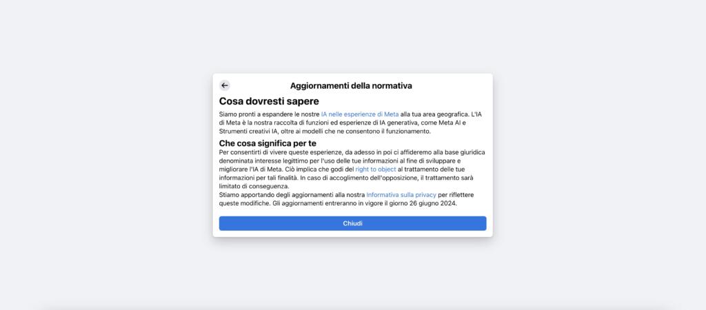 Dunque, Meta passa all’avviso vero e proprio: «Per consentirti di vivere queste esperienze, da adesso in poi ci affideremo alla base giuridica denominata interesse legittimo per l’uso delle tue informazioni al fine di sviluppare e migliorare l’IA di Meta. Ciò implica che godi del right to object al trattamento delle tue informazioni per tali finalità. In caso di accoglimento dell’opposizione, il trattamento sarà limitato di conseguenza. Stiamo apportando degli aggiornamenti alla nostra informativa sulla privacy per riflettere queste modifiche. Gli aggiornamenti entreranno in vigore il giorno 26 giugno 2024».