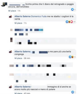 Il post, poi cancellato, recitava: «Ma com’è che su Rai Uno ci sono un sacco di gay? Che è cambiato qualcosa?», con annessa emoticon sorridente. Non si sa a chi facesse riferimento Alberto Salerno, ma non è stato solamente questo post a provocare molta indignazione. Rispondendo ad alcuni commenti, infatti, il noto paroliere ha rincarato più volte la dose: «E poi dicono che la lobby gay non esiste, a me pare più una bella congrega» e altri commenti sul nuovo potere degli omosessuali. Il tutto è stato screenshottato e pubblicato dal sito Gay.it.