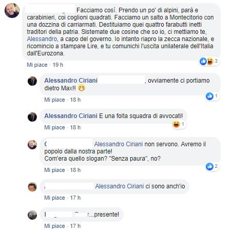 «Facciamo così. Prendo un po’ di alpini, parà e carabinieri, coi coglioni quadrati. Facciamo un salto a Montecitorio con una dozzina di carriarmati. Destituiamo quei quattro farabutti inetti traditori della patria. Sistemate due cosine che so io, ci mettiamo te, Alessandro, a capo del governo. Io intanto riapro la zecca nazionale, e ricomincio a stampare Lire, e tu comunichi l’uscita unilaterale dell’Italia dall’Eurozona». Questo il messaggio che non sono non è stato censurato da Ciriani, ma ha dato vita a un ironico scambio di battute: «Ovviamente ci portiamo dietro Max – risponde il sindaco di Pordenone -. E una folta squadra di avvocati!». La stessa persona ha poi risposto: «non servono. Avremo il popolo dalla nostra parte! Com’era quello slogan? ‘Senza paura’, no?».