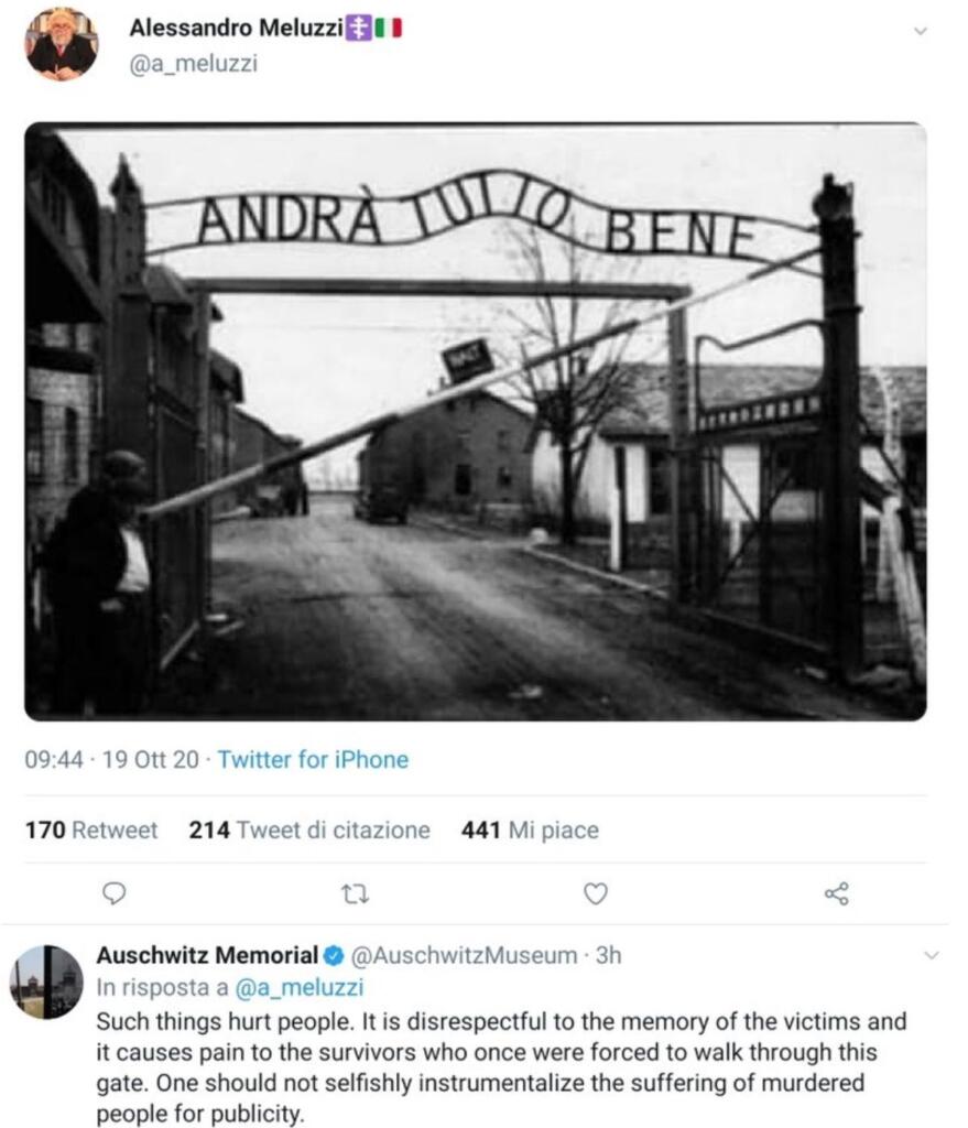 Una mossa di cattivo gusto che ora non esiste più sul profilo di Alessandro Meluzzi. E la cancellazione del contenuto è arrivata dopo l’intervento del profilo Twitter dell’Auschwitz Memorial che già in passato aveva commentato alcune paradossali e vergognose uscite social di altri personaggi italiani che, sempre utilizzando quella foto del cancello dei lager nazisti, facevano ironia e strumentalizzavano una delle più buie pagine della storia del mondo.