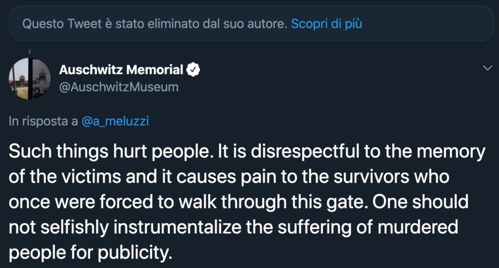 Adesso, invece, la risposta dell’Auschwitz Memorial riporta a un tweet eliminato dall’utente (Meluzzi).