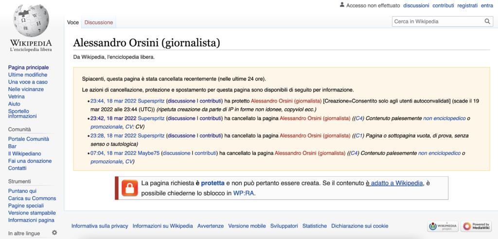 Alessandro Orsini Wikipedia, la pagina cancellata