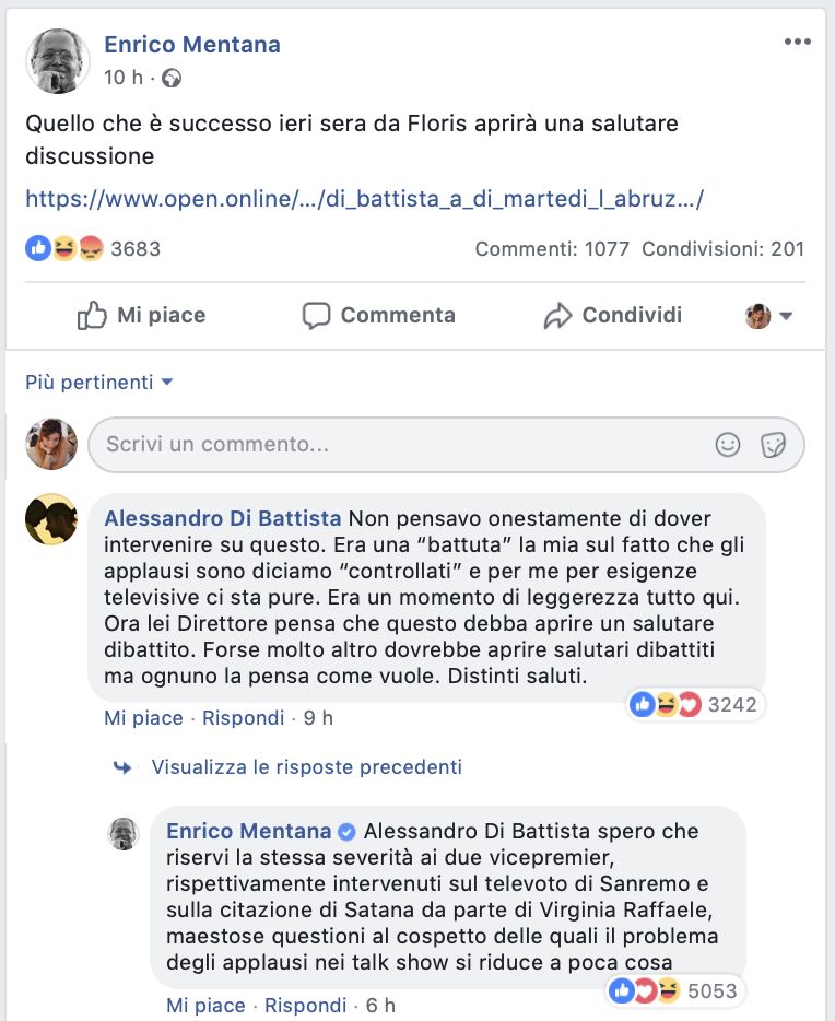 Quando Enrico Mentana ha scritto nel suo post Facebook che «quello che è accaduto ieri sera da Floris aprirà una salutare discussione» forse non si aspettava che nella rosa dei commenti apparisse proprio il diretto interessato, Alessandro Di Battista. Il giornalista infatti stava promuovendo uno degli articoli pubblicati sulla testata online Open, in cui veniva riportata la notizia della battuta di Dibba sui non-applausi del pubblico durante il suo intervento nella trasmissioni di Giovanni Floris Di Martedì, andata in onda il 12 febbraio su La7.