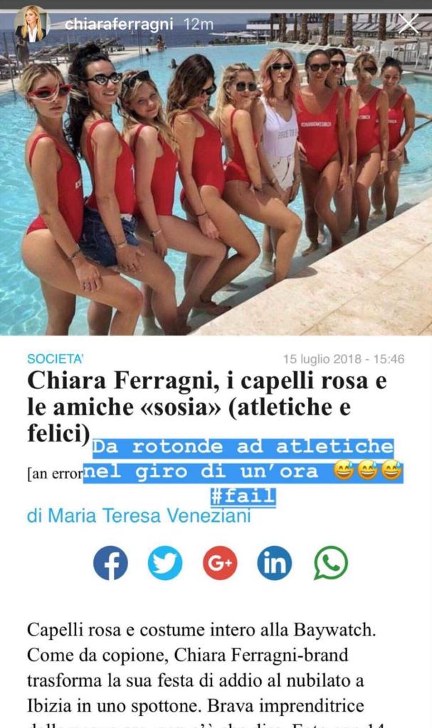 Le parole del Corriere della Sera non sono affatto piaciute a Chiara Ferragni, che ha subito evidenziato la contraddizione attraverso le sue Instagram stories. Come riportato dal sito BitchyF, infatti, la fashion blogger e influencer ha prima preso in giro la testata scrivendo: «Da rotonde ad atletiche nel giro di un’ora #fail»: