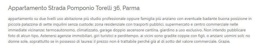 «Ai vicini sono gradite coppie con figli, o anziani; uomini soli; no donne sole, soprattutto se in possesso di laurea». Il titolo di studi, dunque, diventa discriminatorio al pari del sesso e dello status relazionale di chi ha intenzione di approcciarsi all’acquisto di questo appartamento di 140 metri quadrati in via Pomponio Torelli 36. L’immobile, almeno sulle carte stradali, esiste ed è individuabile facendo una rapida ricerca su Google Maps. Ma nell’annuncio Parma – online a questo link – non contiene foto.