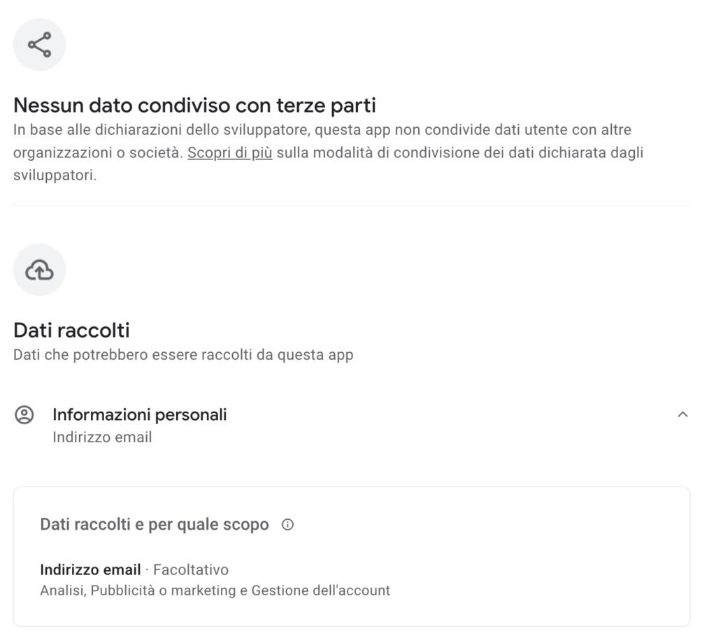 Scorrendo lungo la pagina “Sicurezza dei dati” sul Play Store, Travelstart sostiene di non condividere dati con terze parti e di raccogliere, in modo facoltativo, solamente l’indirizzo mail per “Analisi, pubblicità, marketing e gestione dell’account”.