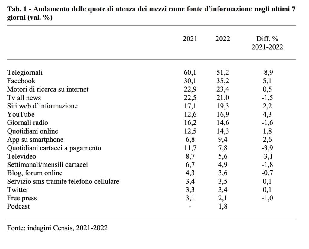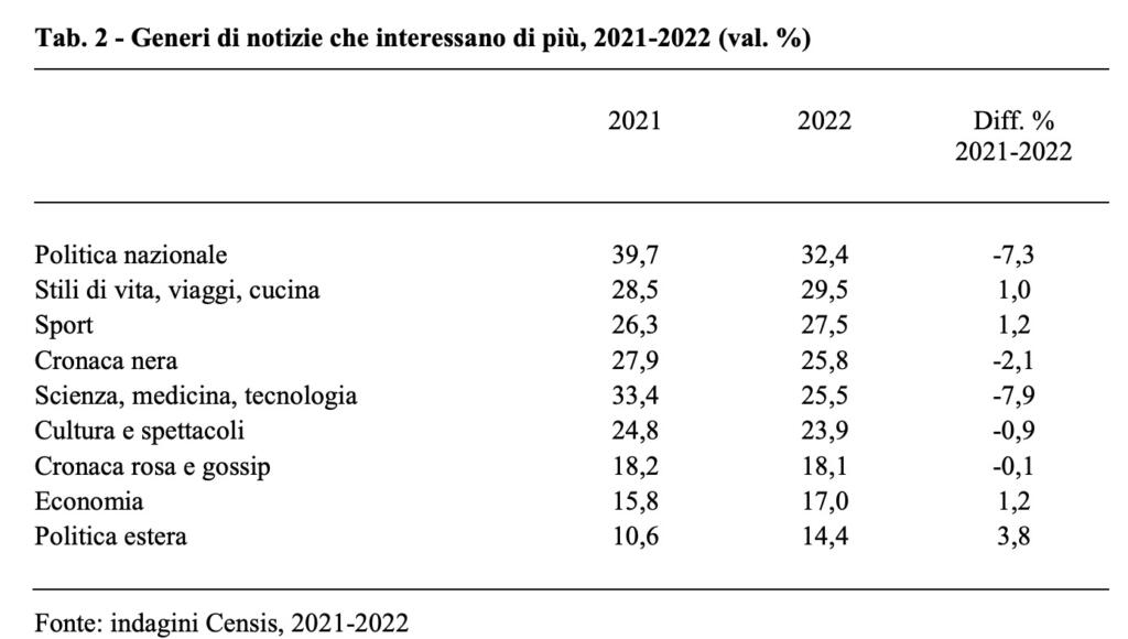 In questa tabella, viene fatto un confronto tra la rilevazione del 2021 e quella del 2022 (purtroppo, non è stato pubblicato un quadro relativo all’ultimi anno). Questi dadi confermano la crisi negli ascolti telegiornali. L’informazione televisiva è sempre in testa alle preferenze degli italiani, ma già lo scorso anno era stato rilevato uno scollamento evidente nel ruolo primario di questo media. Ed era stato messo in evidenza anche un cambio nelle aree di interesse.