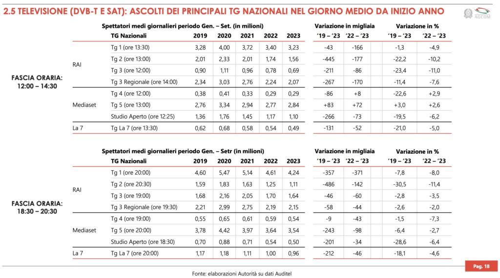 Questo quadro, quasi apocalittico, per l’informazione italiana trova il suo riverbero in altri numeri: quelli della crisi dei telegiornali. Per analizzare ciò che sta accadendo, utilizziamo i dati forniti da Agcom all’interno del suo “Osservatorio sulle comunicazioni” pubblicato alla fine di dicembre del 2023. Con un focus specifico sui tg delle principali emittenti, basati sui dati Auditel.