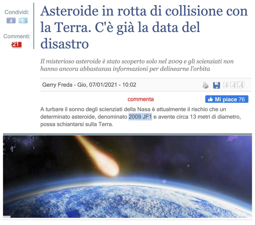 La stella cometa del giornalismo è la caccia del titolo sensazionalistico per ottenere il maggior numero di visualizzazioni. Se poi quel che viene scritto all’interno dell’articolo smentisce la tesi sostenuta dal titolo, pazienza. E così oggi nell’edizione online de il Giornale, troviamo un articolo che ci fa sobbalzare dalla sedia e ci fa gridare «moriremo tutti». E, invece, andando a leggere i dati, nulla di quanto sostenuto è realistico. Quindi, la notizia dell’asteroide colpisce la terra (con tanto di data) è del tutto fuori luogo e ha come obiettivo quello di attirare i lettori con un titolo tra il terroristico e l’allarmante.