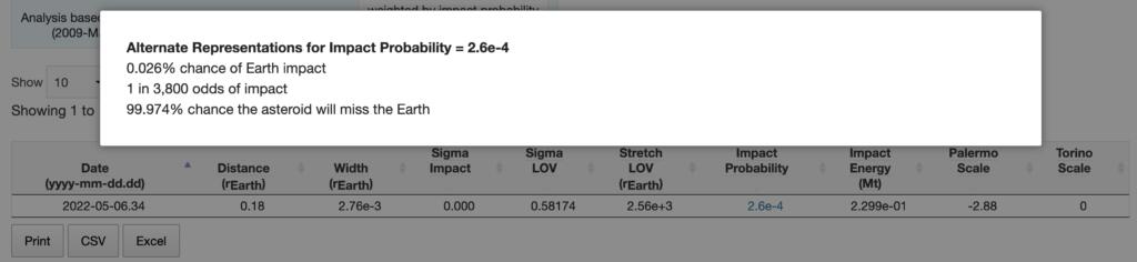 Il quotidiano dà la certezza dell'impatto nel maggio 2022, ma la probabilità è inferiore allo 0,03%