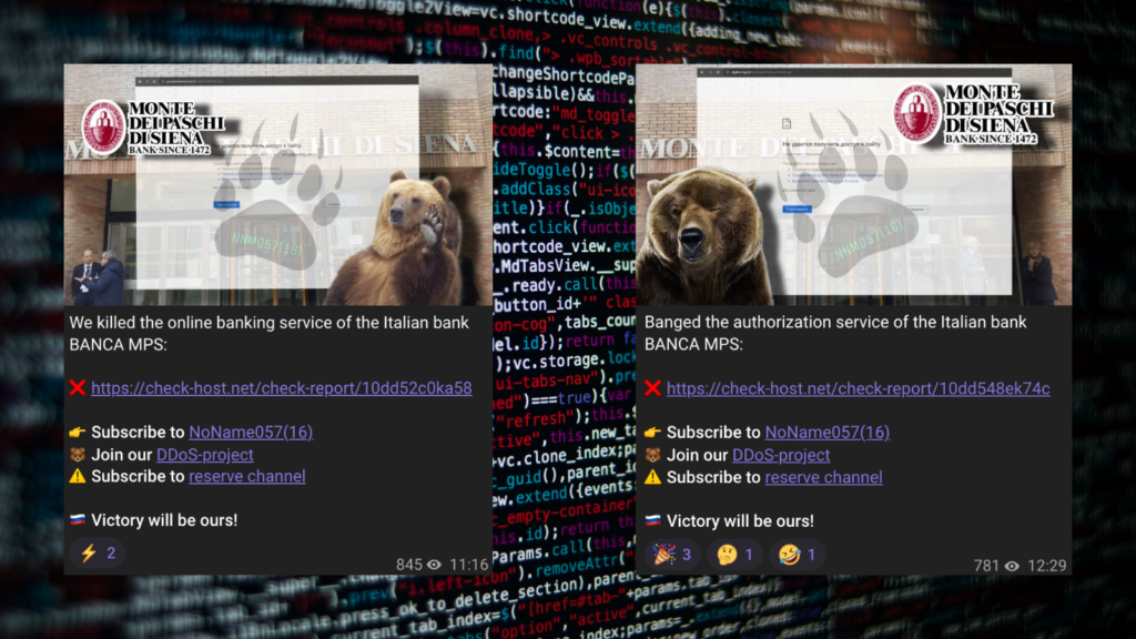 Per capire meglio, partiamo da due rivendicazioni di NoName057 pubblicate sul loro canale Telegram (in lingua inglese). Partiamo da Monte dei Paschi di Siena. Alle 11.16, infatti, viene postato il primo messaggio in cui si parla dell’attacco al sito di MPS. Poi, poco più di un’ora dopo, ecco un’altra specifica: colpito anche – sempre con modalità DDoS – il sistema di autorizzazione. Questo vuol dire che a non funzionare (per alcune ore) non è stata solamente la homepage da browser, ma anche in servizi in app, perché l’utente non poteva autenticarsi per accedere al proprio conto corrente.