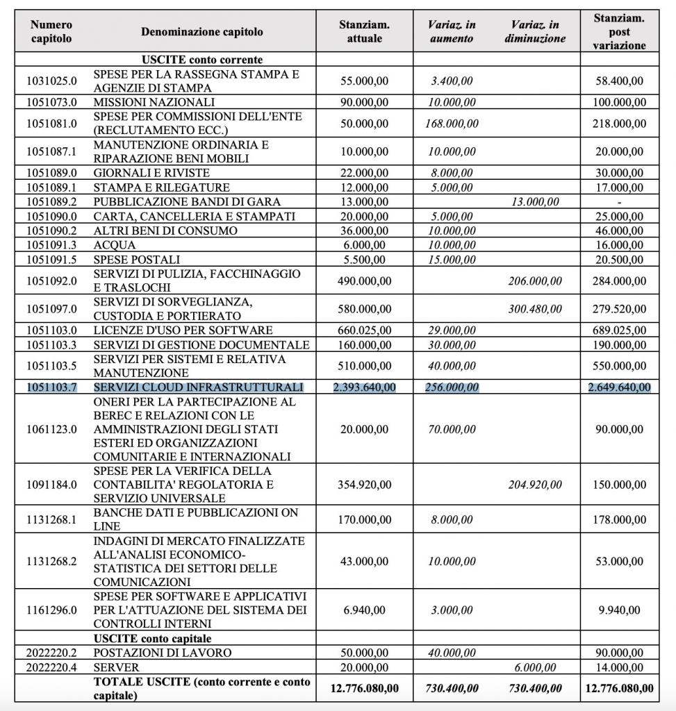 Secondo il documento (ufficiale) sulla “Variazione al bilancio di previsione 2024“, a fine ottobre Agcom ha approvato alcuni aumenti e tagli. Tra questi, come spiegato nel dettaglio all’interno della relazione tecnica, è stato aumentato di ben 256mila euro lo stanziamento destinato ai “Servizi cloud infrastrutturali” utilizzati per il funzionamento di alcuni servizi dell’Autorità: