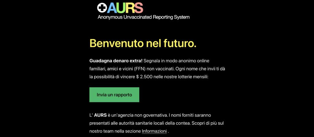 Come detto, il portale esiste. Nel messaggio che compare in homepage si legge: «Guadagna denaro extra! Segnala in modo anonimo online familiari, amici e vicini (FFN) non vaccinati. Ogni nome che invii ti dà la possibilità di vincere $ 2.500 nelle nostre lotterie mensili. L’AURS è un’agenzia non governativa. I nomi forniti saranno presentati alle autorità sanitarie locali della contea. Scopri di più sul nostro team nella sezione informazioni».