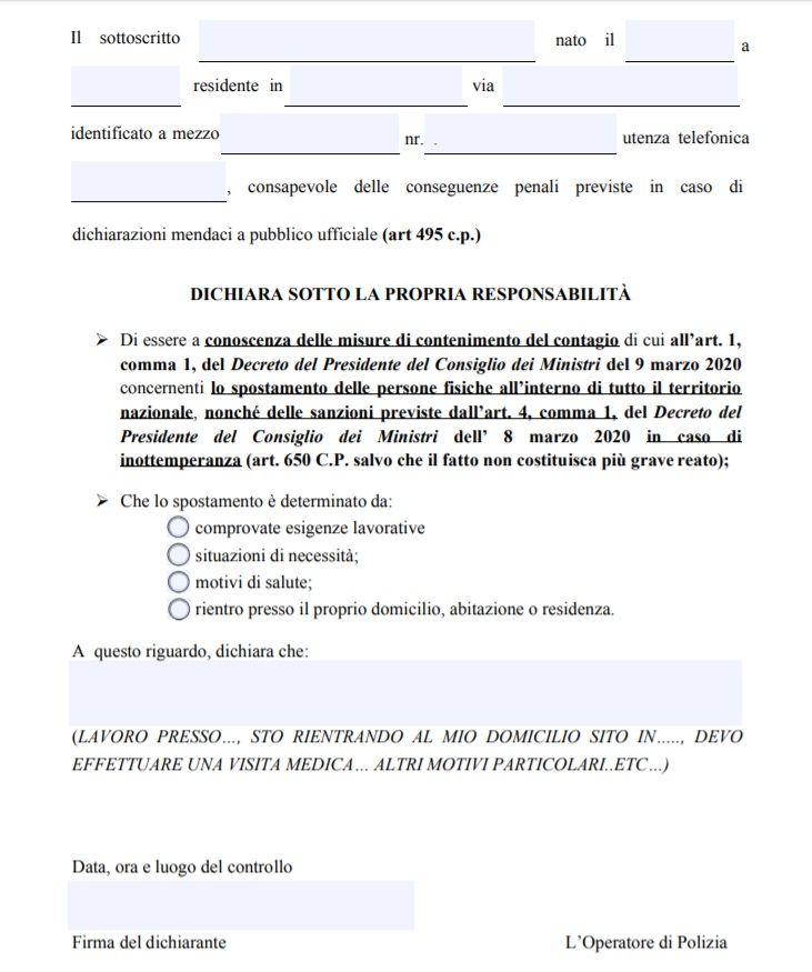 Chiunque non avesse la possibilità di stampare il testo dovrà comunque copiarlo e portare la dichiarazione con sé per esibirla in caso di controllo. Per gli spostamenti quotidiani o a scadenza fissa è possibile, indicando la frequenza dello spostamento, utilizzare lo stesso modulo. Questo vale, per esempio, nei casi di coloro che si spostano per cure mediche o per assistere parenti malati. Qualora si fosse fermati dalle forze dell’ordine verrà data la possibilità di fare la dichiarazione in quel momento; la medesima verrà trascritta e eventualmente verificata successivamente. Al cittadino il compito di dimostrare che si è detta la verità. Qualora le verifiche dessero esito negativo scatterà la denuncia per inosservanza del provvedimento con l’arresto fino a tre mesi e una denuncia per reati dolosi contro la salute pubblica.