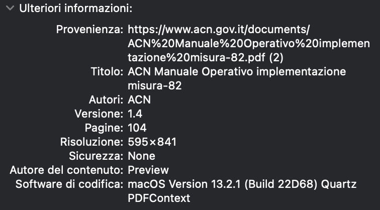 Tutto parte dalla pubblicazione, avvenuta sabato scorso (4 marzo 2022), del documento contenente il manuale operativo implementazione misura #82 che indica i KPI, caricato sul sito di ACN in formato .pdf. Materiale tecnico di supporto alla Strategia Nazionale di Cybersicurezza. Ed è proprio dai metadati di quel file che è nato il caso “Accenture”, la società multinazionale di consulenza strategica e direzionale e dell’esternalizzazione che aveva vinto il bando Consip. Perché, come individuato da Michele Pinassi – responsabile della Cybersicurezza presso l’Università degli Studi di Siena -, quel file non riportava la “firma” (come autore/autrice) dell’ACN nella versione originale.