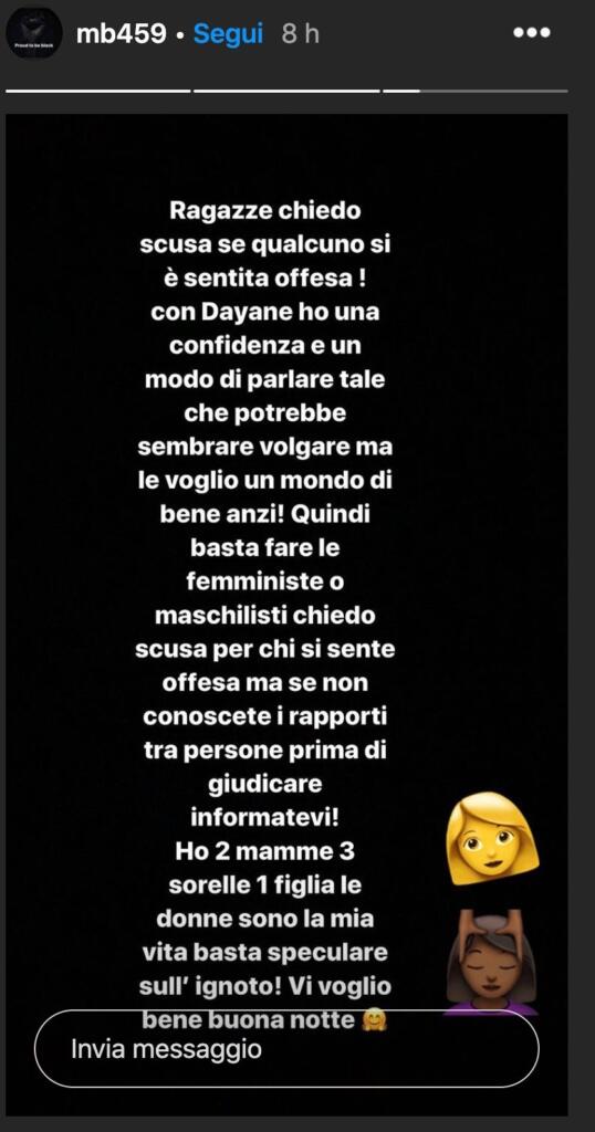 «Ragazze chiedo scusa se qualcuno si è sentita offesa! Con Dayane ho una confidenza e un modo di parlare tale che potrebbe sembrare volgare ma le voglio un mondo di bene anzi! Quindi basta fare le femministe o maschilisti, chiedo scusa per chi si sente offesa ma se non conoscete i rapporti tra persone prima di giudicare informatevi. Ho 2 mamme, 3 sorelle, 1 figlia, le donne sono la mia vita, basta speculare sull’ignoto! Vi voglio bene, buona notte».