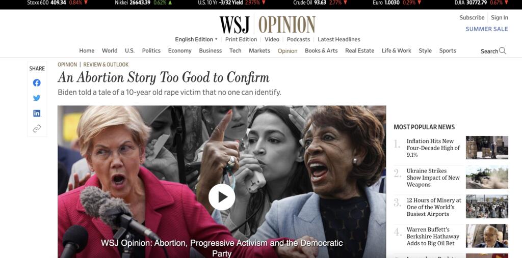 «Una storia da una sola fonte su un bambino di 10 anni e un aborto diventa virale». L’unica fonte citata in questo paradossale tentativo di debuking è, in realtà, un medico – la dottoressa Caitlin Bernard – che aveva portato alla luce questa vicenda. Ma il Wall Street Journal è riuscito a fare di peggio.