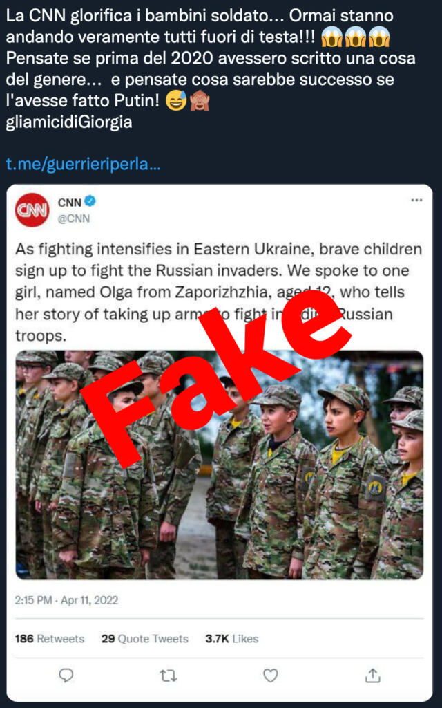 Condividono screenshot fasulli e poi si lamentano sui social perché nessuno prende seriamente le “notizie” che vogliono spacciare per buono. Ovviamente tutte contro l’Ucraina in un misto tra l’esaltazione mistica di Vladimir Putin e l’abbaglio democratico di Mosca. L’ultima storia – che ripete sempre gli stessi cliché – si basa su un presunto tweet e articolo della CNN in cui la testata legata all’emittente televisiva americana esalterebbe i bambini soldato in Ucraina. Peccato che si tratti di un falso, ma chi pende dalle labbra della propaganda russa ci ha creduto.