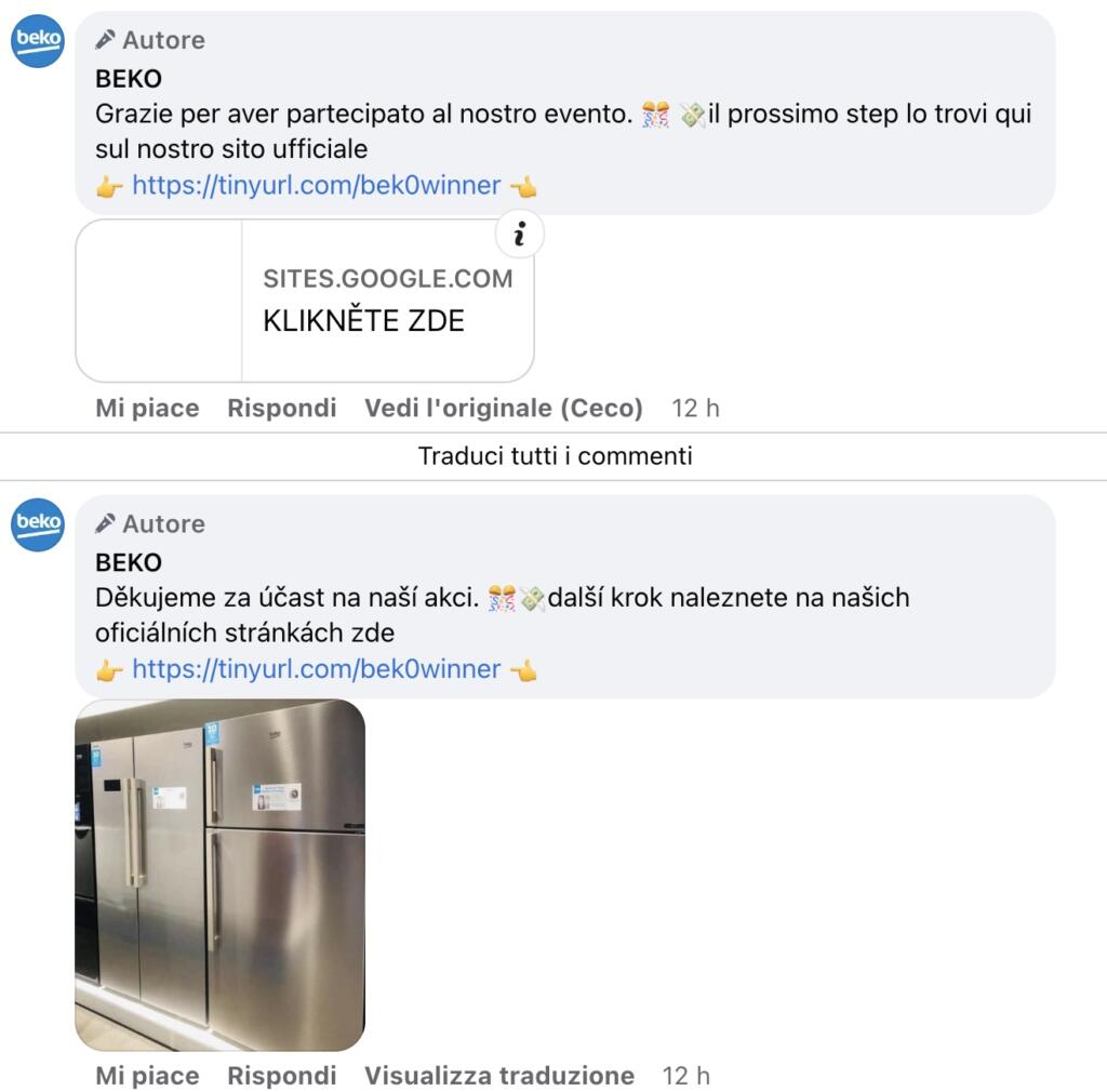 Lo spartito è sempre lo stesso, ma questa volta con un passaggio ulteriore nel tentativo di accreditarsi agli occhi della potenziale vittima di questa truffa online. Si parte da una base Facebook, con un annuncio che fa riferimento a uno specifico “compleanno” o “anniversario”. Poi si mettono in palio dei premi da ricevere a casa – e anche in tempi strettissimi – a costo zero. E questa è la storia della truffa – o phishing social – di Beko che regala frigoriferi a chi scrive nei commenti allo stesso post la parola “Beko”.