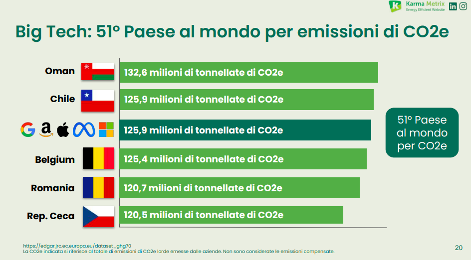 Per quanto riguarda il totale delle emissioni di CO2e lorde (ed escludendo quelle compensate), Google, Amazon, Apple, Meta e Microsoft – insieme – sono il 51° Paese più inquinante al mondo. Il peso equivale a 125,9 milioni di tonnellate di CO2 emessa, pari alle emissioni del Cile e superiore alle emissioni del Belgio.