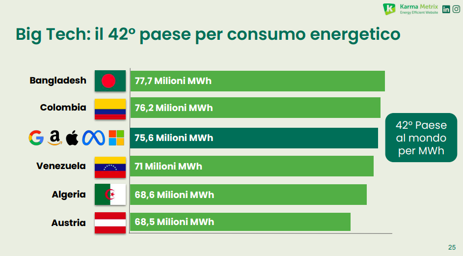 Andando a vedere il dato sul consumo energetico, poi, Big Tech scala ulteriormente la classifica: 42° Paese per consumo energetico con 75,6 milioni MWh sfruttati. Più del Venezuela e appena meno della Colombia.