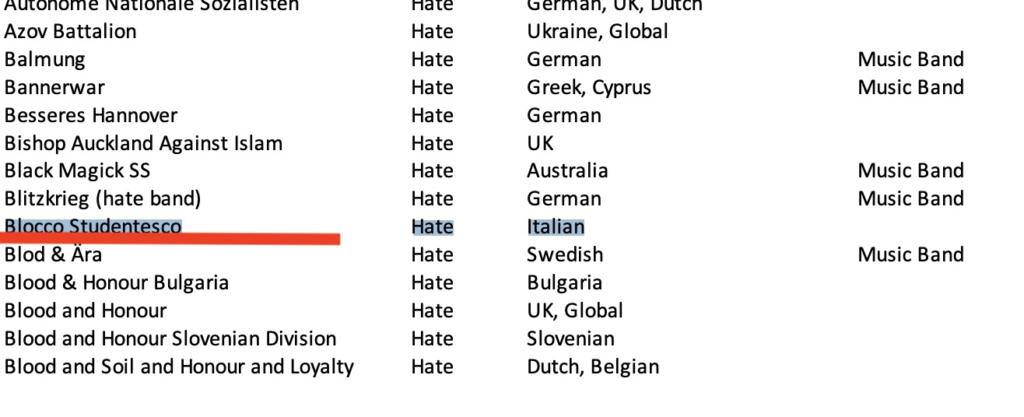 Come si può notare da questa Blacklist Facebook sui gruppi italiani, 16 su 17 sono stati categorizzati sotto l’etichetta “hate” (odio). Ci sono i movimenti di estrema destra ben noti – e non solo per gli eventi degli ultimi giorni – come Forza Nuova, CasaPound Italia, Lealtà e Azione, Lotta Studentesca e Blocco Studentesco.