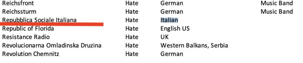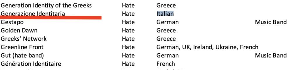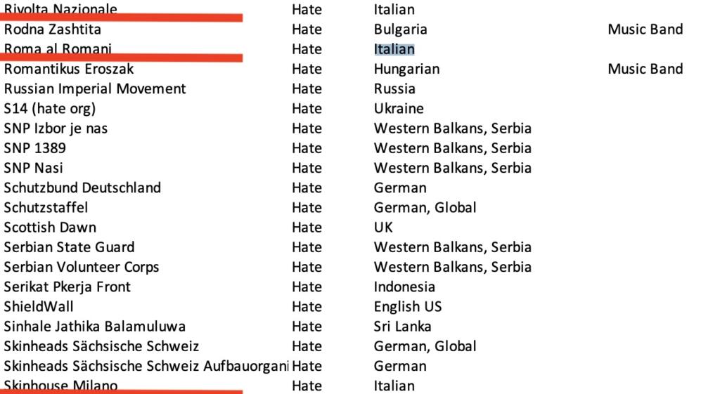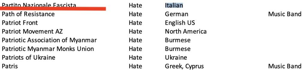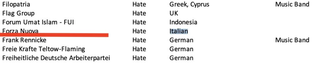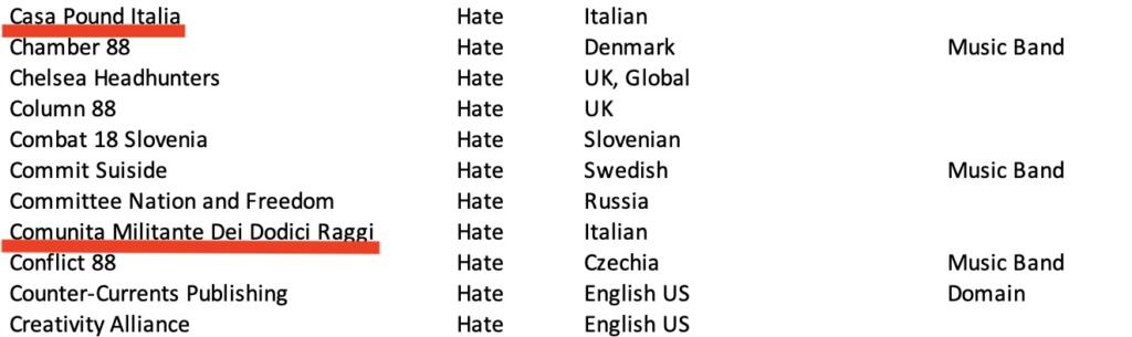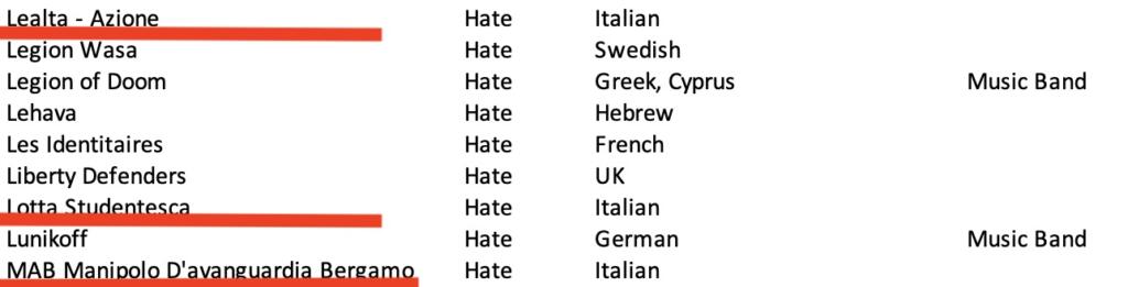 Come si può notare da questa Blacklist Facebook sui gruppi italiani, 16 su 17 sono stati categorizzati sotto l’etichetta “hate” (odio). Ci sono i movimenti di estrema destra ben noti – e non solo per gli eventi degli ultimi giorni – come Forza Nuova, CasaPound Italia, Lealtà e Azione, Lotta Studentesca e Blocco Studentesco.