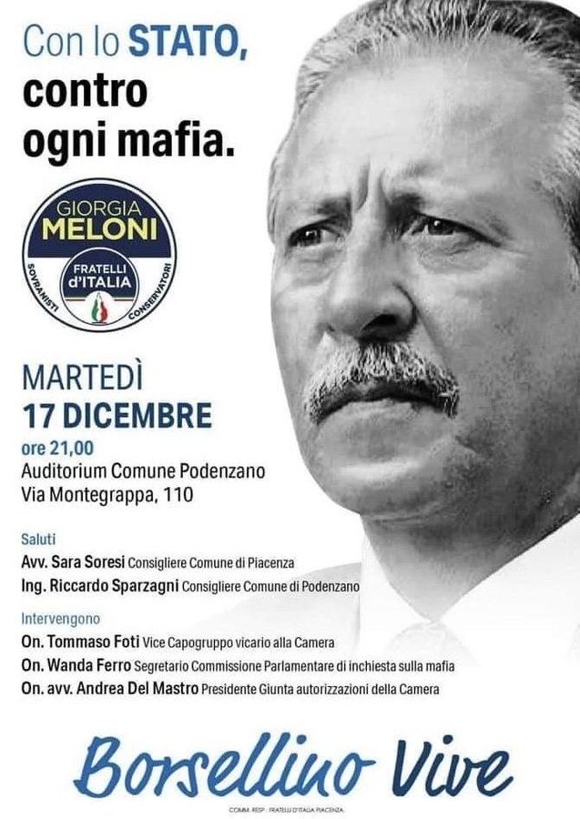 Il tutto perché martedì sera, a Podenzano (in provincia di Piacenza), Fratelli d’Italia ha tenuto un comizio al quale hanno partecipato anche Giorgia Meloni, Tommaso Foti, Wanda Ferro e Andrea Del Mastro. E per pubblicizzare l’evento e attirare più persone, Fratelli d’Italia ha realizzato alcuni manifesti utilizzando il volto di Paolo Borsellino. Una scelta che non è andata giù ai figli del magistrato ucciso dalla mafia, che hanno protestato con un veemente comunicato.