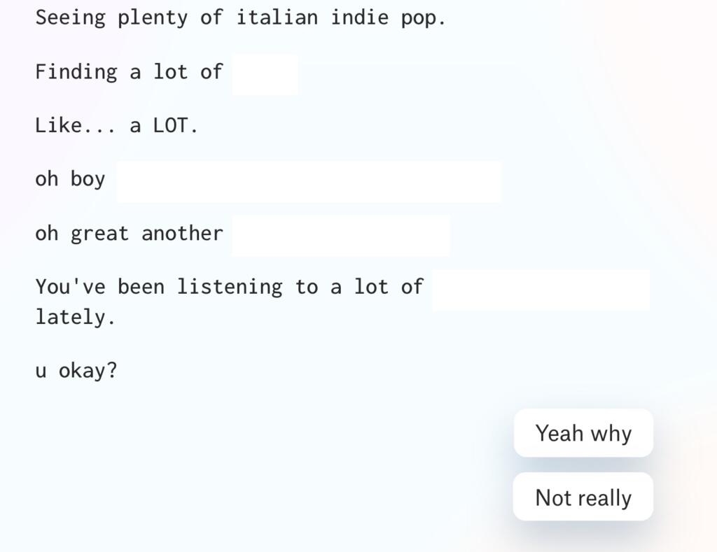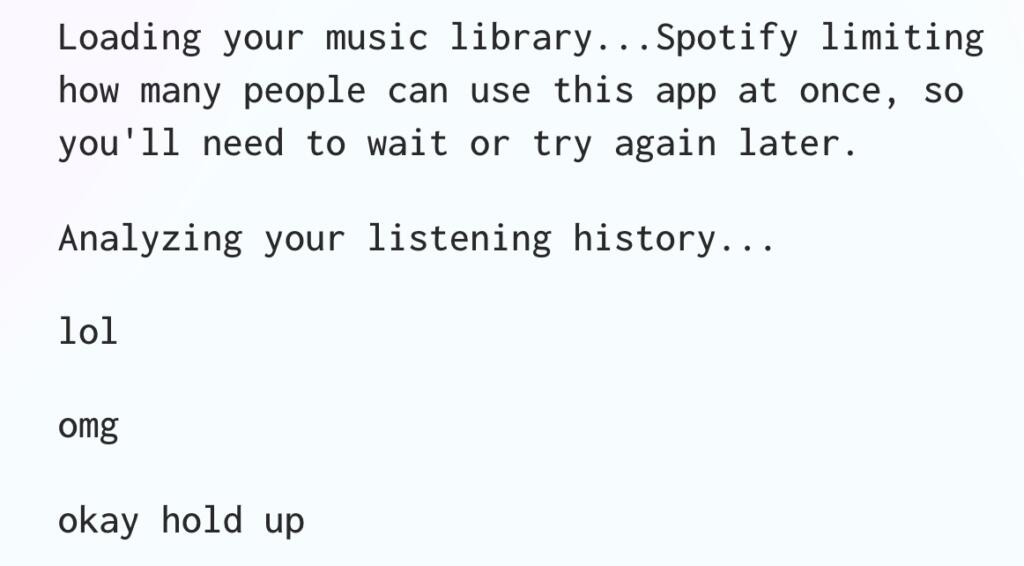 La realtà supera la fantasia. A creare questo bot valuta Spotify sono stati Mike Lacher & Matt Daniels ed è fruibile, gratuitamente e liberamente, sul sito Pudding. E da lì inizia il viaggio nel proprio recente passato musicale. Ovviamente bisognerà consentire l’accesso (solo in fase di lettura) al proprio profilo Spotify e poi interagire con l’intelligenza artificiale per una valutazione accurata.