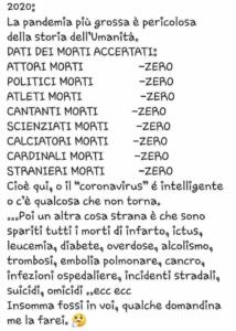 … Poi un (‘) altra cosa strana è che sono spariti tutti i morti di infarto, ictus, leucemia, diabete, overdose, alcolismo, trombosi, embolia polmonare, cancro, infezioni ospedaliere, incidenti stradali, suicidi, omicidi, ecc ecc.
