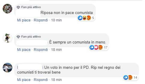 Questa è solo una selezioni di alcuni dei commenti che si stanno riproducendo uno sopra l’altro sulle notizia della morte di Camilleri riportata dai vari giornali. I nomi di chi si è fregiato di queste parole di odio sono stati censurati (come facciamo sempre) perché l’obiettivo è quello di denunciare un fenomeno e non di porre sulla gogna mediatico questa o quella persona. Facendo il contrario, invece, ci renderemmo tutti rei dello stesso tipo di atteggiamento.