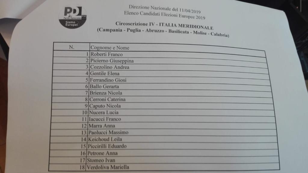 A guidare la lista nella circoscrizione meridionale che comprende Abruzzo, Molise, Campania, Puglia, Basilicata e Calabria sarà Franco Roberti, come annunciato qualche giorno fa. Completano le liste: