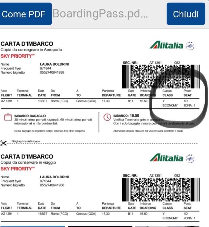 Tuttavia, Giornalettismo è in grado di mostrare la carta d’imbarco dell’ex presidente della Camera Laura Boldrini, regolarmente emessa 24 ore prima del volo con check-in online. Sul documento si evince che sin dal primo momento la deputata di Liberi e Uguali aveva quel posto lì – l’1D per la precisione – in classe Economy. Non solo: il passeggero che ha denunciato l’episodio e che ha anche avanzato una propria teoria a Il Giornale sull’andamento dei fatti («So come funziona, l’ufficio della Camera preposto per le prenotazioni aeree dei parlamentari prende i posti che vuole e fanno spostare la gente») ha anche affermato che l’ex presidente della Camera aveva con sé la scorta.
