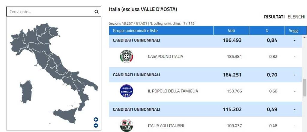 CasaPound è poco sotto all’1%, allo 0,94%,mentre Italia agli italiani, la lista di Forza Nuova e Fiamma Tricolore, è allo 0,36%. Al Senato, dove lo scrutinio è più avanzato, vicino all’80%, CasaPound sta allo 0,84%, mentre Italia agli italiani allo 0,49%.