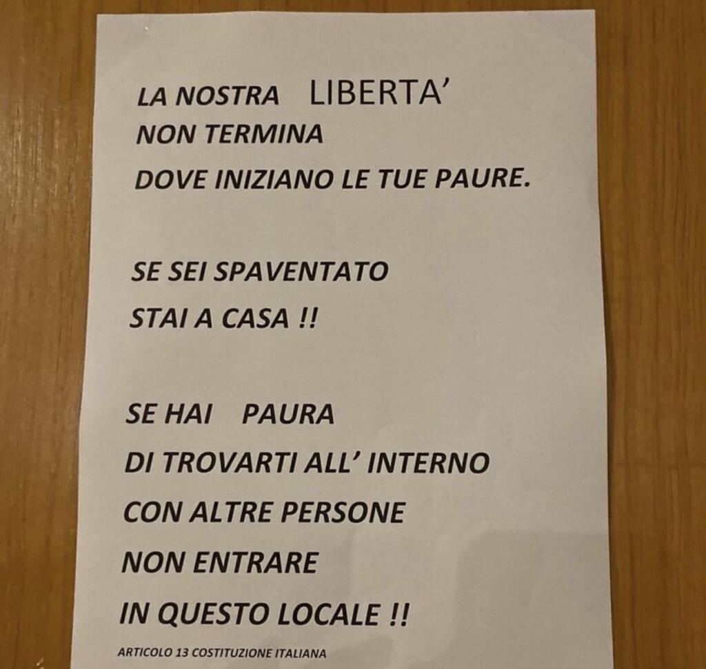 «Prima di entrare ci son questi cartelli che allego in foto a mo’ di minaccia per i clienti, entrando tutto il locale tappezzato di questi fogli; entri e non ti misurano la temperatura, mascherine dei camerieri o inesistenti (barista) o portate con naso scoperto, solo un cameriere l’aveva addosso portata come si deve, bravo lui. Invece che tranquillizzare la clientela con cartelli che confermano la pulizia la disinfezione e le norme igienico-sanitarie che attuano, scrivono che se hai paura devi star a casa. Consiglio un ripasso del codice civile e di avere un po’ di rispetto per i dipendenti e i clienti». E, allegata a questa recensione, c’è l’immagine del cartello esposto sia all’entrata che all’interno del locale.