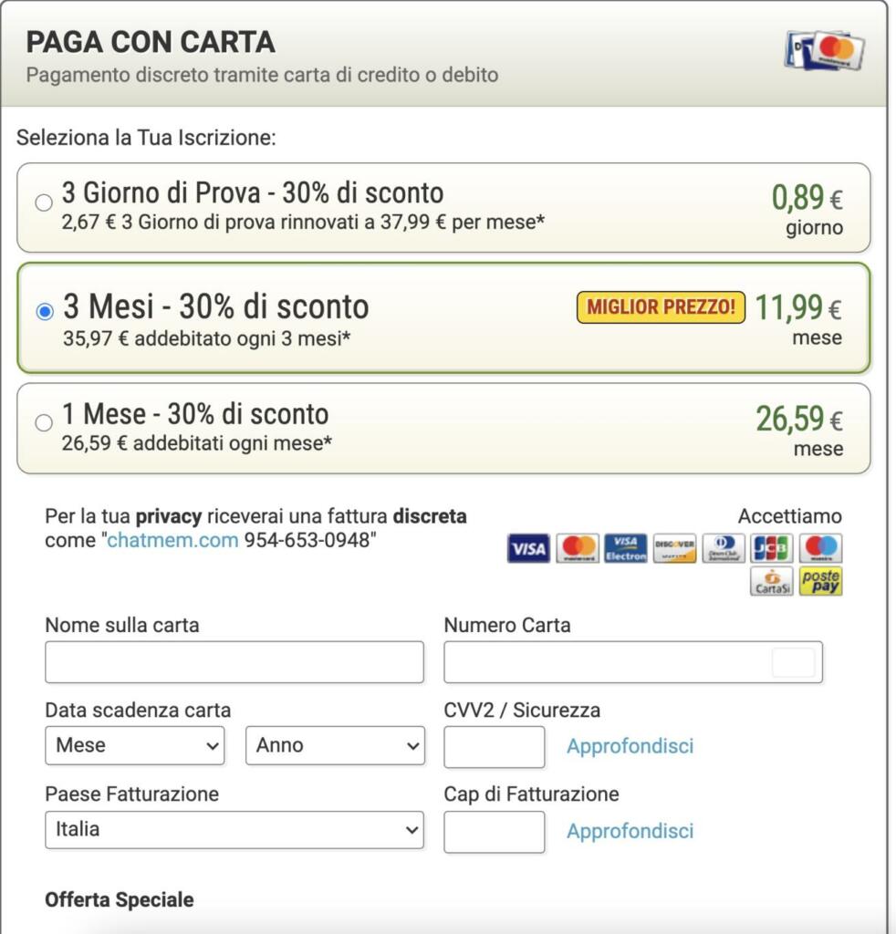 Stessi importi, a parte l’opportunità di usufruire dell’offerta (non eucaristica) per chi decide di sfruttare le funzioni “premium”, con i primi tre giorni di prova lasciando in pegno un obolo da soli 89 centesimi al dì. Insomma, il mercato nel Tempio inizia proprio dalla prima accoglienza che ci riserva Chat Cattolica subito dopo la nostra iscrizione.