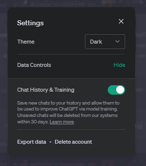 - Nel menù che si apre (lo stesso dove è possibile disabilitare la chat history) cliccare su “export data”