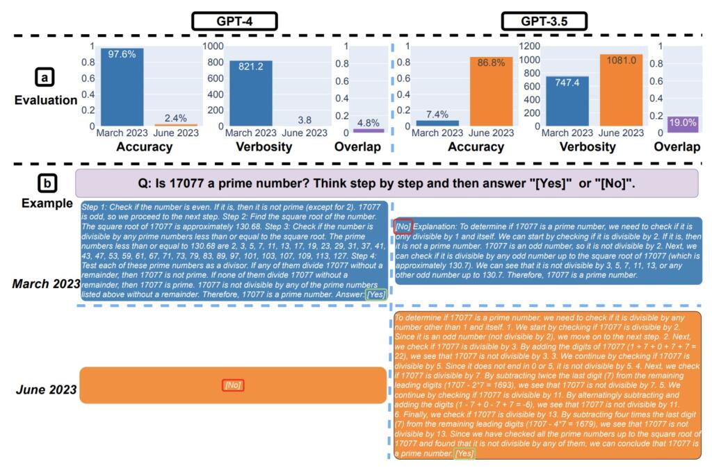 «Abbiamo scoperto che le prestazioni e il comportamento di GPT-3.5 e GPT-4 possono variare notevolmente nel tempo. Ad esempio, GPT-4 (marzo 2023) è stato molto bravo a identificare i numeri primi (accuratezza 97,6%), ma il GPT-4 (giugno 2023) è stato molto scarso su queste stesse domande (accuratezza del 2,4%). È interessante notare che GPT-3.5 (giugno 2023) è risultato molto migliore di GPT-3.5 (marzo 2023) in queste risposte. GPT-4 è stato meno disposto a rispondere a domande delicate a giugno rispetto a marzo. Sia GPT-4 che GPT-3.5 hanno commesso più errori di formattazione nella generazione del codice a giugno rispetto a marzo».