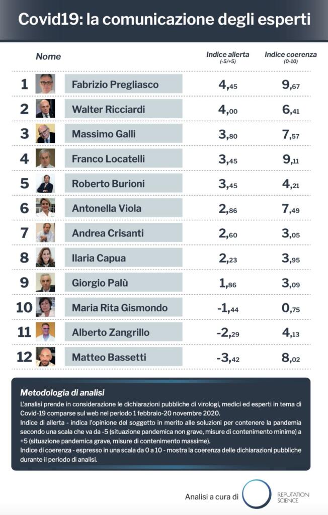 Dall’analisi sulle dichiarazioni degli esperti emerge un principio di forte incoerenza dietro al nome di Maria Rita Gismondo. E Reputation Science valuta così il giudizio negativo: «Indice di allerta negativo (-1,44), salita agli albori delle cronache per aver definito il coronavirus una ‘problematica appena superiore all’influenza’. Sul tema della prima e seconda ondata, si discosta dalla linea del Governo soprattutto sulla chiusura degli stadi, dei locali notturni e sull’uso della mascherina all’aperto. Nel tempo ha presentato delle contraddizioni sulla virulenza del Covid-19 e sull’uso della mascherina che le ha causato diverse critiche, tra cui una diffida legale da parte del Pts per aver minimizzato sulla pericolosità del virus».