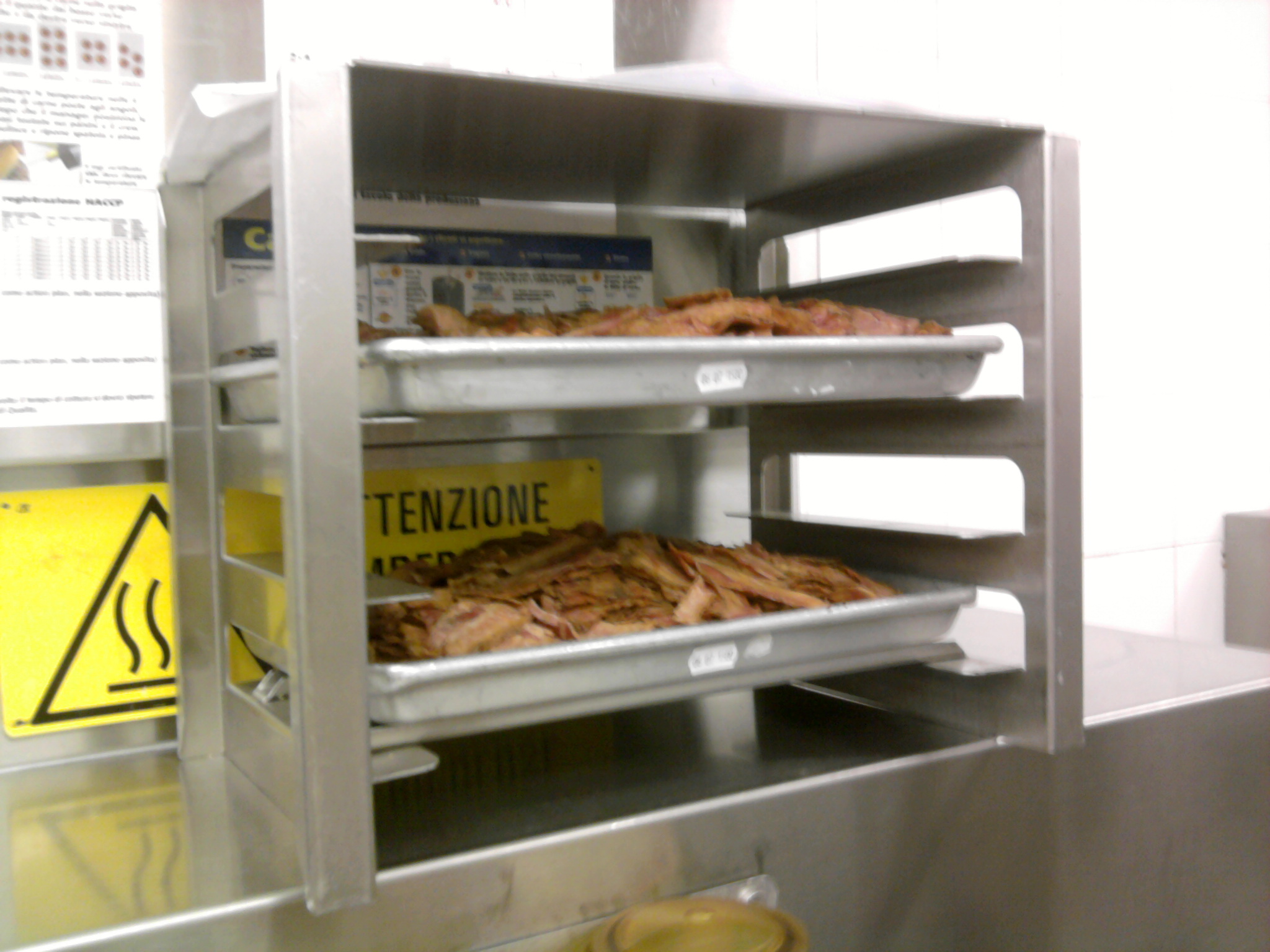 LA COTTURA – Il pane viene tostato per 35 secondi. Avete presente la griglia per i panini dei chioschi notturni? L’idea è simile, con la differenza che si tratta di un macchinario temporizzato con un apposito cicalino che inizia a suonare quando è il momento di levare via il pane. La carne invece viene cotta in apposite piastre automatiche dalla temperatura fissa di 180 gradi. Ogni piastra è regolata a seconda del panino da creare, quindi vuol dire che in quella degli hamburger non verrà cotta la carne del Big Mac. Al fianco di questi macchinari ci sono le “ceste” con dentro la carne surgelata la quale dovrebbe essere raccolta con dei guanti monouso per poi essere depositata sulla piastra. Diciamo dovrebbe perché durante la visita un addetto non lo ha fatto.