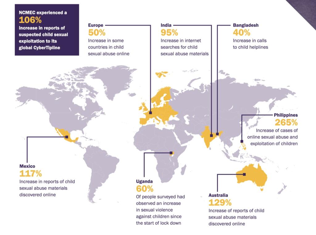 «La portata dello sfruttamento e degli abusi sessuali sui minori online è in aumento. Questa crescita sostenuta sta superando la nostra capacità globale di risposta», si legge nel report realizzato dalla ONG WeProtect Global Alliance. Una conferma arriva anche dagli ultimi rapporti – che risalgono al 2020 – della Polizia Postale in Italia che hanno evidenziato la crescita esponenziale di questo fenomeno, soprattutto durante le fasi iniziali del lockdown e della pandemia. E anche a livello globale la situazione è molto simile, se non peggiore in molti Paesi. Questa, per esempio, è una mappa che mostra l’incremento