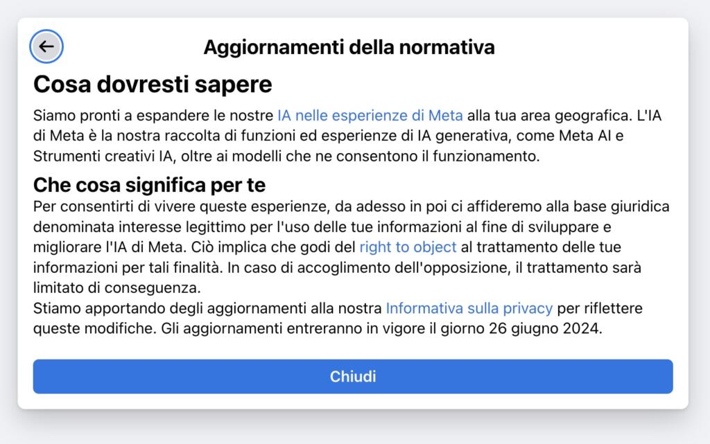 Molti utenti europei e britannici hanno ricevuto nelle ultime ore una notifica sui propri account Instagram e Facebook in cui si parla dell’imminente arrivo dell’intelligenza artificiale di Meta sulle sue piattaforme. Oltre alla breve descrizione di come sarà “meraviglioso” il mondo dei social network attraverso queste nuove funzioni, viene citato il cosiddetto “legittimo interesse” dell’azienda per quel che riguarda il trattamento dei dati personali degli utenti. La base giuridica è fondamentale in questi casi e, in attesa che le autorità deputate alla tutela della privacy nel Vecchio Continente verificheranno quanto ci sia di realmente legittimo in questa “richiesta” (ai sensi del GDPR), esiste un modo per contestare questa ulteriore profilazione. Infatti, c’è un modulo online (un form) da compilare per negare l’accesso ai dati personali per l’addestramento di Meta AI. Questa contestazione, però, sarà valutata seguendo il principio di discrezionalità da parte del team di Menlo Park.