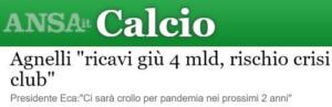 Parliamo di un articolo di ANSA, peraltro molto breve e di facile consultazione. in cui sono state riportate le dichiarazioni di Andrea Agnelli circa la forte preoccupazione per la crisi del settore (in generale) per l’enorme calo di fatturato in tutta Europa.