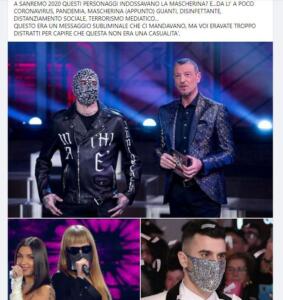 “Era tutto programmato!” – Alcuni cantanti, a Sanremo 2020, indossavano una mascherina. Per i complottisti era un evidente messaggio subliminale e la prova provata che ci troviamo al cospetto di un complotto globale.