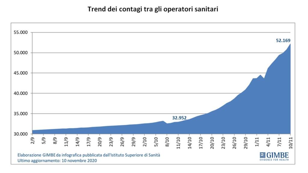 «Negli ultimi 30 giorni si sono verificati 19.217 contagi, rispetto ai 1.650 dei 30 giorni precedenti – spiega Nino Cartabellotta, Presidente della Fondazione Gimbe -. Oltre al rischio di focolai ospedalieri, in RSA e in ambienti protetti, preoccupa l’impatto sul personale sanitario, già in carenza di organico oltre che provato dalla prima ondata». Ecco lo schema che mostra la crescita dei contagi tra operatori sanitari.
