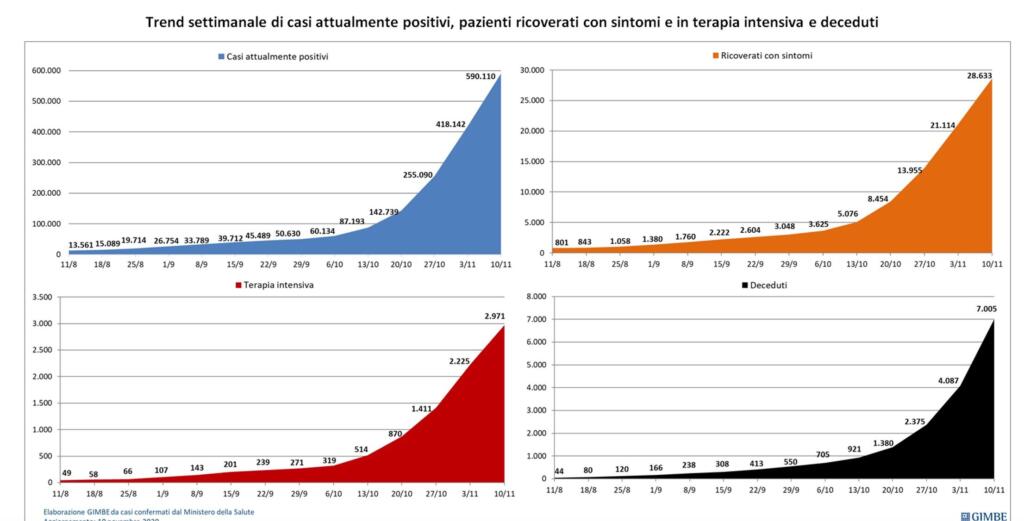 Tutti numeri con il ‘più’ davanti, a indicare un trend in crescita per quel che riguarda tutti gli aspetti legati a questa seconda ondata della pandemia da Coronavirus. Ecco gli schemi che mostrano la crescita esponenziale dell’emergenza.