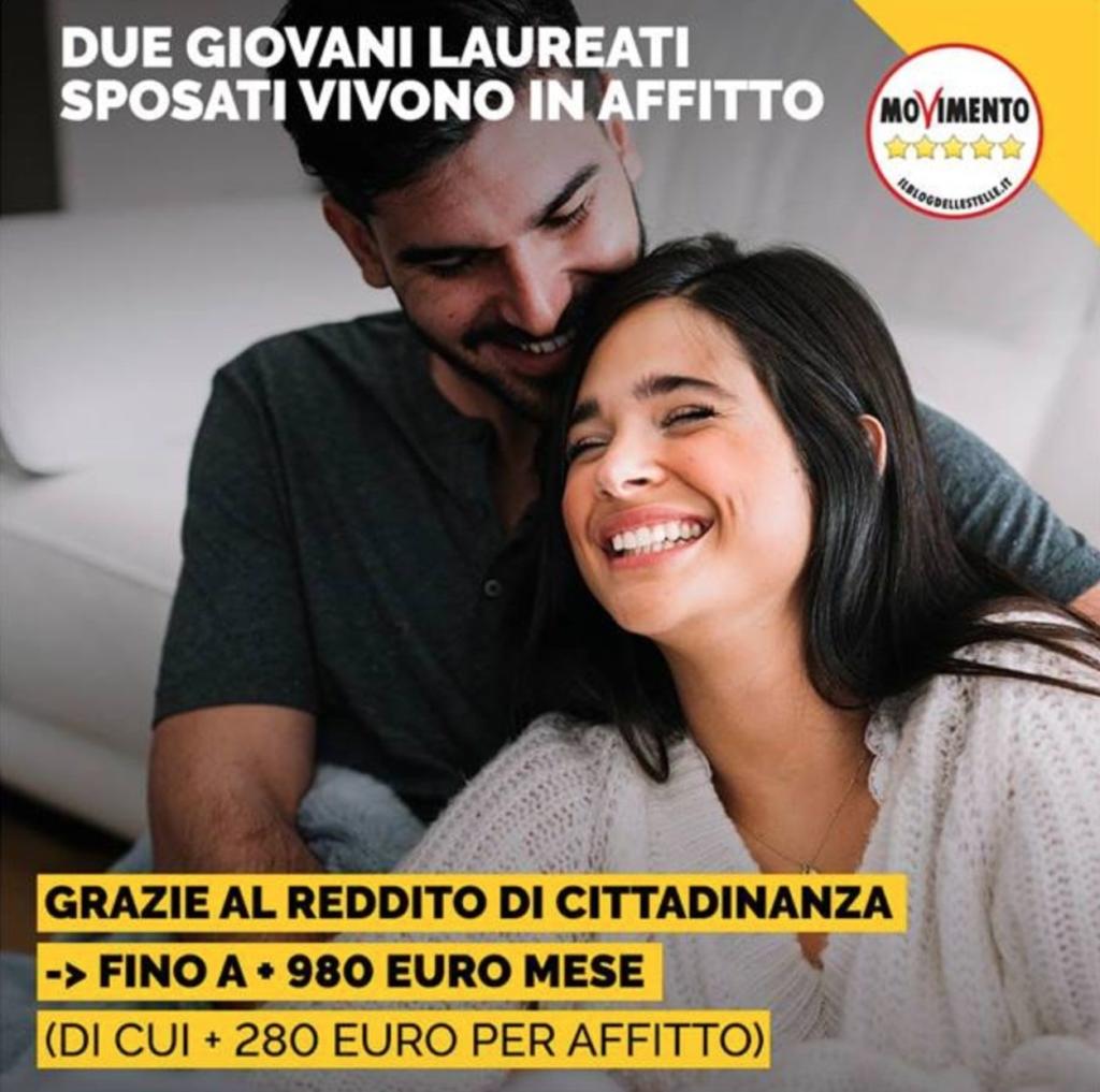 Da qualche ora, tuttavia, la slide del Movimento 5 Stelle che spiega come due giovani – Giulia e Filippo – abbiano deciso di andare a vivere insieme all’età di 32 anni è stata rimossa. La loro storia è ancora presente, tuttavia, sul sito del Movimento 5 Stelle – alla voce ‘Il reddito di cittadinanza (spiegato bene)’ – recita: «La famiglia Verdi, invece, è composta da Giulia e Filippo, due giovani laureati di 32 anni che si sono appena sposati e vivono in affitto. Giulia lavora come cameriera nel ristorante vicino casa e guadagna 600 euro al mese, mentre Filippo è alla disperata ricerca di un lavoro. Ora lo Stato verrà incontro a Giulia e Filippo, garantendogli un’integrazione al proprio reddito, così da avere 980 euro al mese, di cui 280 euro per pagare l’affitto. Nel frattempo Filippo si attiverà per trovare il lavoro tanto atteso».
