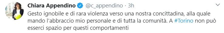 Ferma la condanna di Chiara Appendino, sindaca di Torino. Parla di un «gesto di rara violenza» ai danni di una «nostra concittadina» e di una Torino in cui «non può esserci spazio per questi comportamenti». Non manca di mandare un abbraccio alla donna da parte sua e da parte di tutta la città.