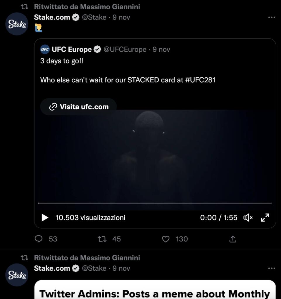 Tweet e ritweet dal profilo di Stake.com nelle ultime ore, mentre in precedenza le attività di ricondivisione arrivavano anche sui contenuti pubblicati da Binance, una delle principali aziende di criptovalute e di blockchain.